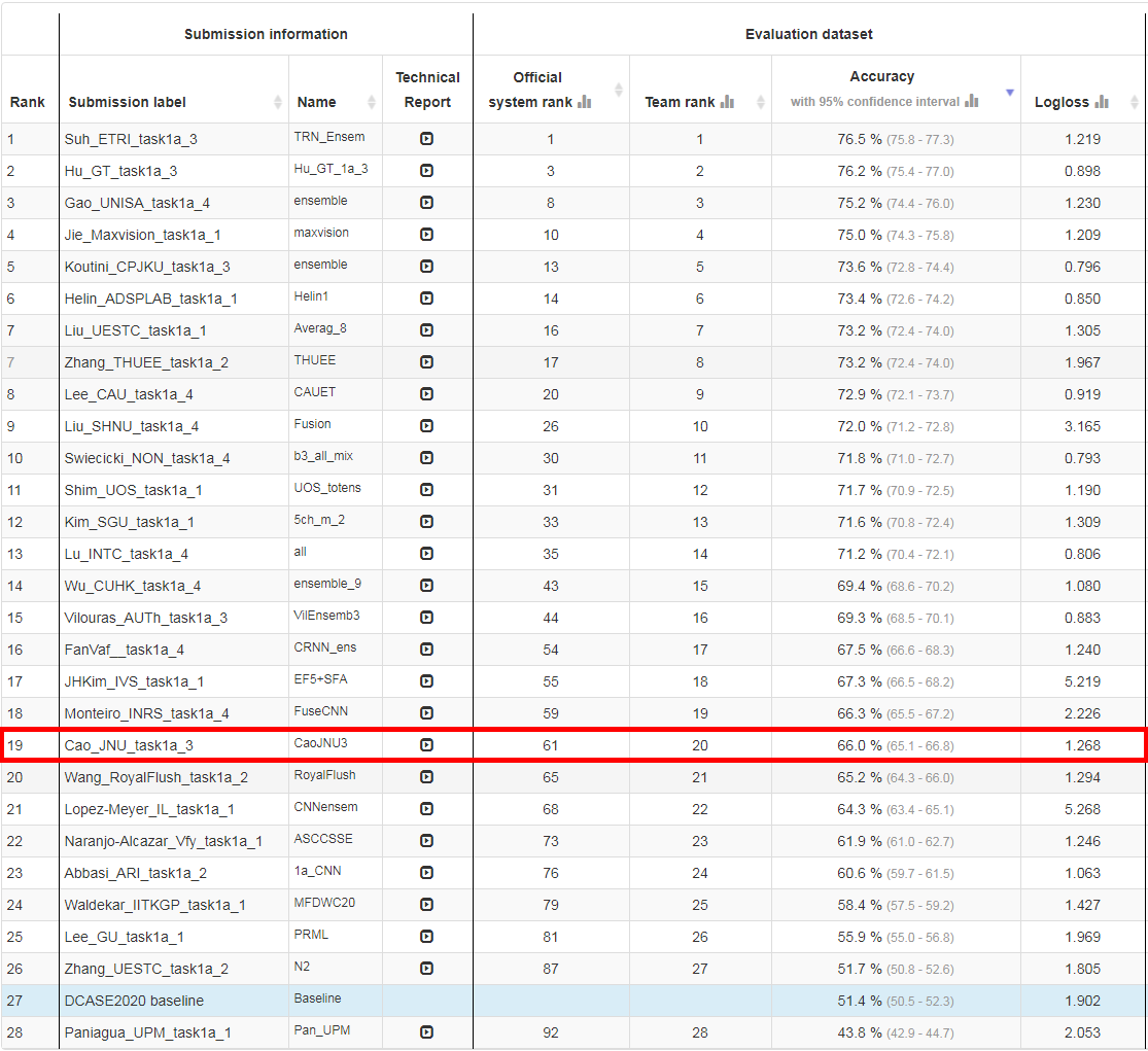 2020全球声学场景和事件的检测和分类竞赛(DCASE2020 Challenge, IEEE AASP Challenge on Detection and Classification of Acoustic Scenes and Event)于7月1日圆满落下了帷幕,在全体师生的共同努力下,由星空体育登录网页入口机械工程学院曹毅教授指导的声学场景分类团队Cao_JNU(团队成员:硕士研究生费鸿博、黄子龙、刘晨,指导教师:曹毅)首次参加该项比赛便取得了优异的成绩。