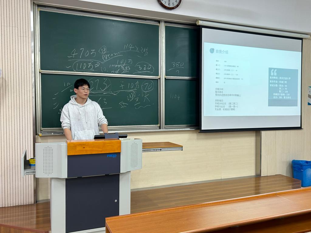 随着各高校研究生招生考试复试通知的陆续出炉,为帮助考研学生深入了解复试内容、掌握面试技巧,提升考研复试通过率,近日,机械工程学院在1A102教室开展“‘研’途有我,全程守护”考研复试经验分享会,会议邀请了对外经济贸易大学硕士、考研全程规划专家程跃进行复试培训,共计51名学生参与,毕业年级辅导员萧欣彤主持本次活动。积极引导并助力学生顺利上岸。