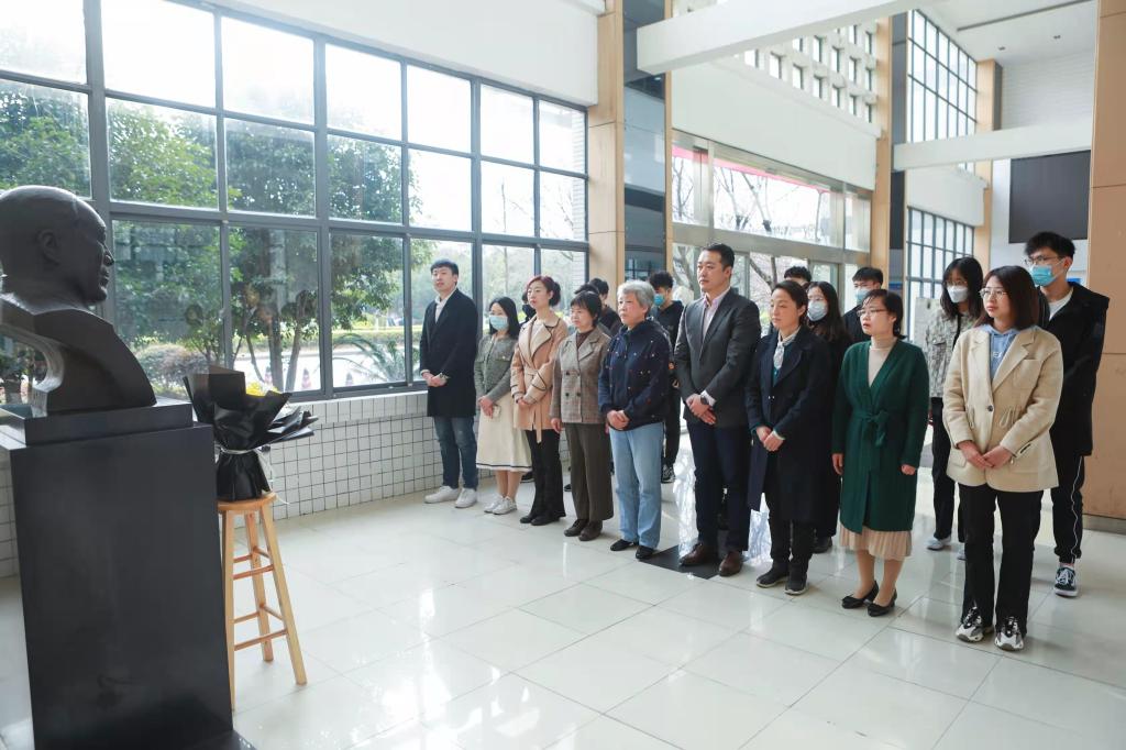 君远学院学生林丽英、彭默雷代表莘莘学子敬献鲜花,李可带领全体师生在塑像前三鞠躬默哀,再次表达对唐翔千先生的深切缅怀。