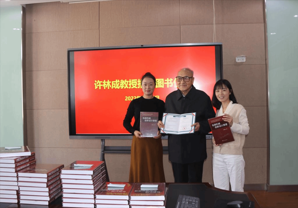 首先是赠书仪式。赵军华代表机械工程学院师生向许林成老先生献花。许老先生是无锡轻工业学院建院老教师,全国包装工程(主攻包装机械)高等教育创始人之一,中国包装工程学会授予包装科技教育终身成就奖,享受国务院政府特殊津贴。耄耋之年(91岁)再添力作,专著《包装机械创新设计原理》于2022年2月正式出版。接着,许林成老先生分别向图书馆、学院师生捐赠40本《包装机械创新设计原理》。陶岚代表校图书馆接受捐赠并颁发学校捐赠证书,学院师生代表一一接受老先生亲手赠书并合影留念。
