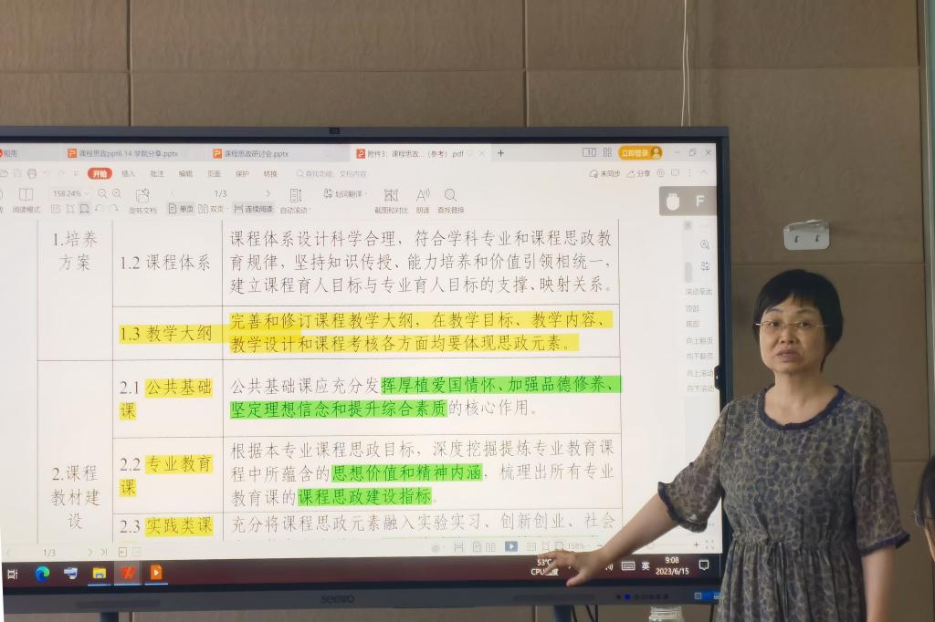 接着,开展课程思政研讨会的自由讨论环节,机器人系主任蒋毅介绍机器人专业课程思政建设经验并提出问题“是不是每门课的课程思政都一样?是不是不同课程应该有侧重分工?”。包装系党支部委员潘瞭和机械设计与制造系主任闫俊霞分别总结了相关专业的课程思政建设工作和取得的成效。基础系主任沈培玉分享了基础系课程思政教学经验及后期的工作安排。与会教师就相关议题进行了积极交流、充分研讨,会议达到了预期成效。