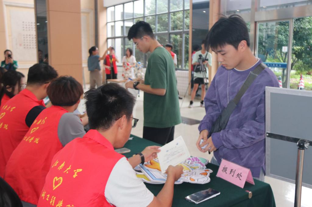 一大早,学生志愿者、学院学工团队就紧锣密鼓地投入到报到工作中。在报到大厅,新生们依次进行身份验证、信息确认、材料提交等一站式报到,轻松完成入学报到。学院还特别开通了学费缓交“绿色通道”,保证每一位学子都能顺利入学。在橙园志愿服务站,志愿者为新生热情服务,耐心解答。