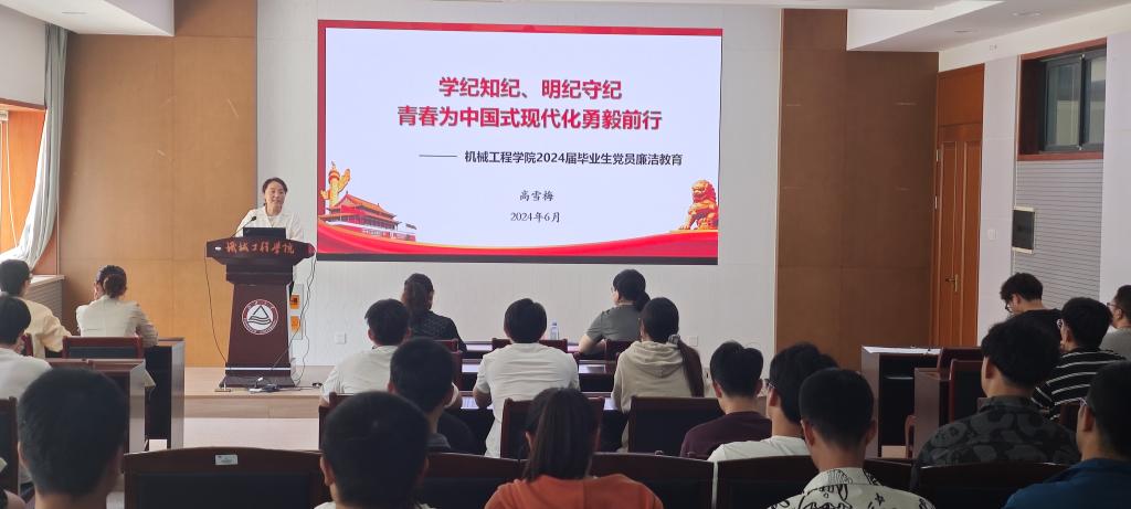 为扎实推进党纪学习教育,加强毕业生党员教育管理,6月18日下午,机械工程学院举办党纪学习教育专题党课暨毕业生党员教育大会。学院党委书记高雪梅,党委副书记兼副院长刘升恒,专职组织员梁楠,学工办主任、分团委书记孟召双及全体毕业生党员参会。会议由党建辅导员宋京姝主持。