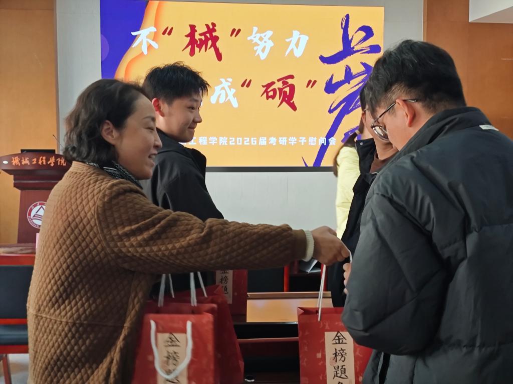 全国硕士研究生招生考试临近,为帮助考研学子提振信心、舒缓压力,传递学院的深切关怀与殷切期许,机械工程学院于11月28日上午在学院楼C302开展“暖心护航,研途绽放”2026届考研慰问活动,学院党委书记高雪梅、党委副书记、副院长刘升恒、系部主任,2022级班主任及百余名考研学子齐聚一堂,共赴这场温暖的考前之约。